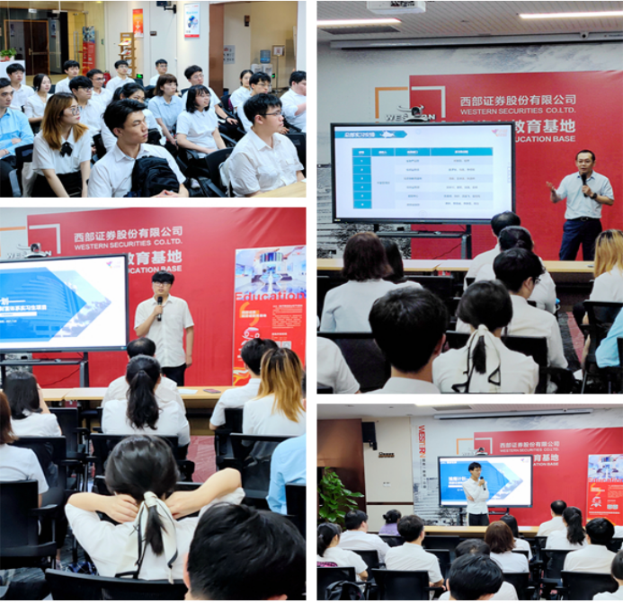 启动仪式结束后,根据西部证券财富体系“分支机构+总部”的总分式实习规划,同学们正式开启岗位实习工作。在为期三周的分支机构岗位实习工作中,同学们对证券公司财富体系一线日常工作进行系统性学习,了解掌握包括柜台业务、综合业务、客户接待工作、报表类统计工作在内的各类财富一线基础工作;在为期一周的财富总部业务实习工作中,同学们有针对性的对金融产品、投资顾问、网络金融、投资者教育等业务进行了探讨学习和专题研究,帮助同学们对证券财富管理业务有了全方位的深入了解和认知。