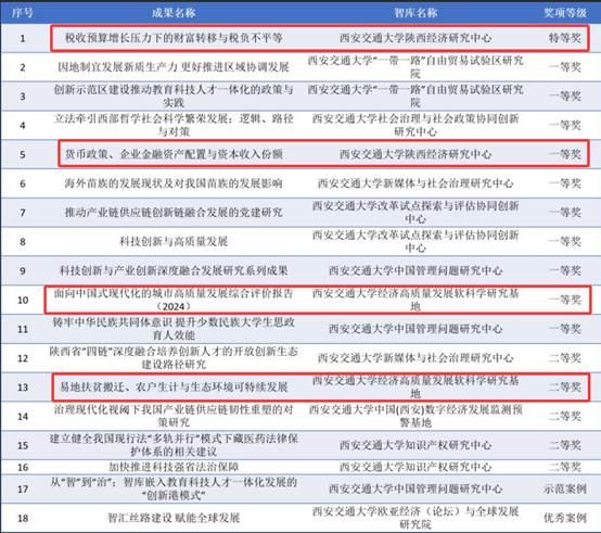 学院智库“陕西经济研究中心”入选CTTI2025年度高校智库百强榜A智库,两项成果分别荣获特等奖及一等奖。学院智库“经济高质量发展软科学研究基地”两项成果分别荣获一等奖及二等奖。